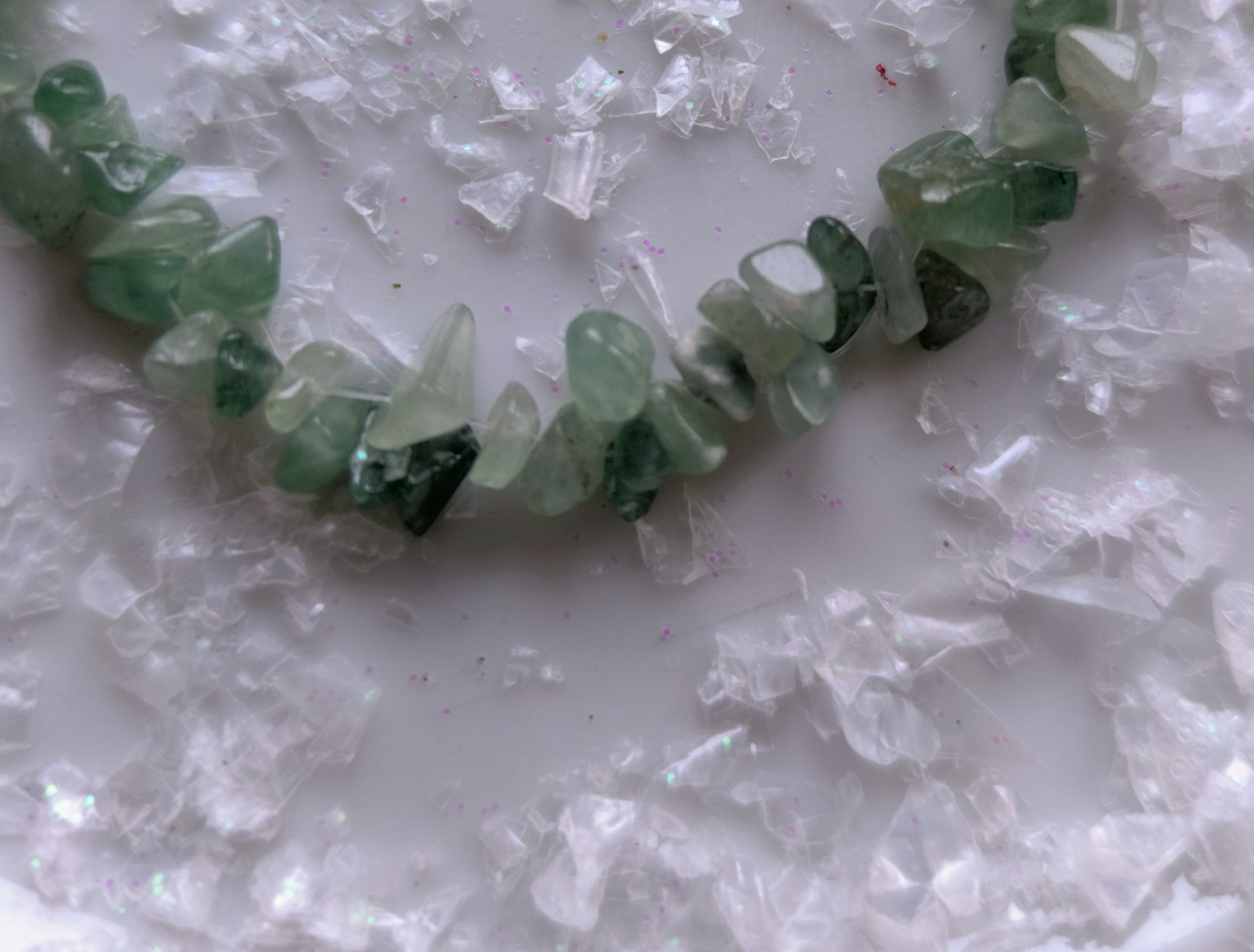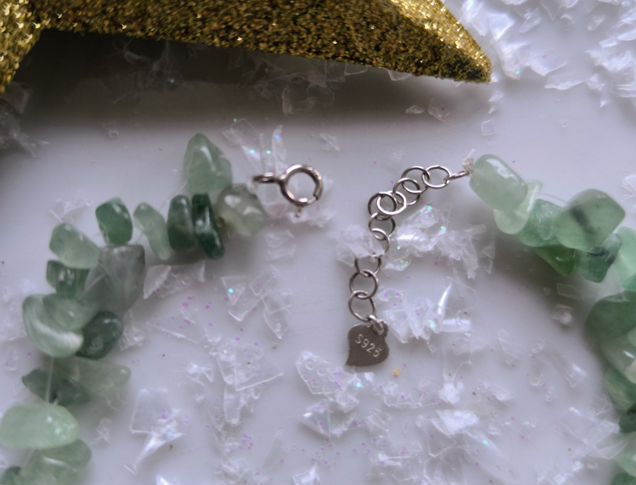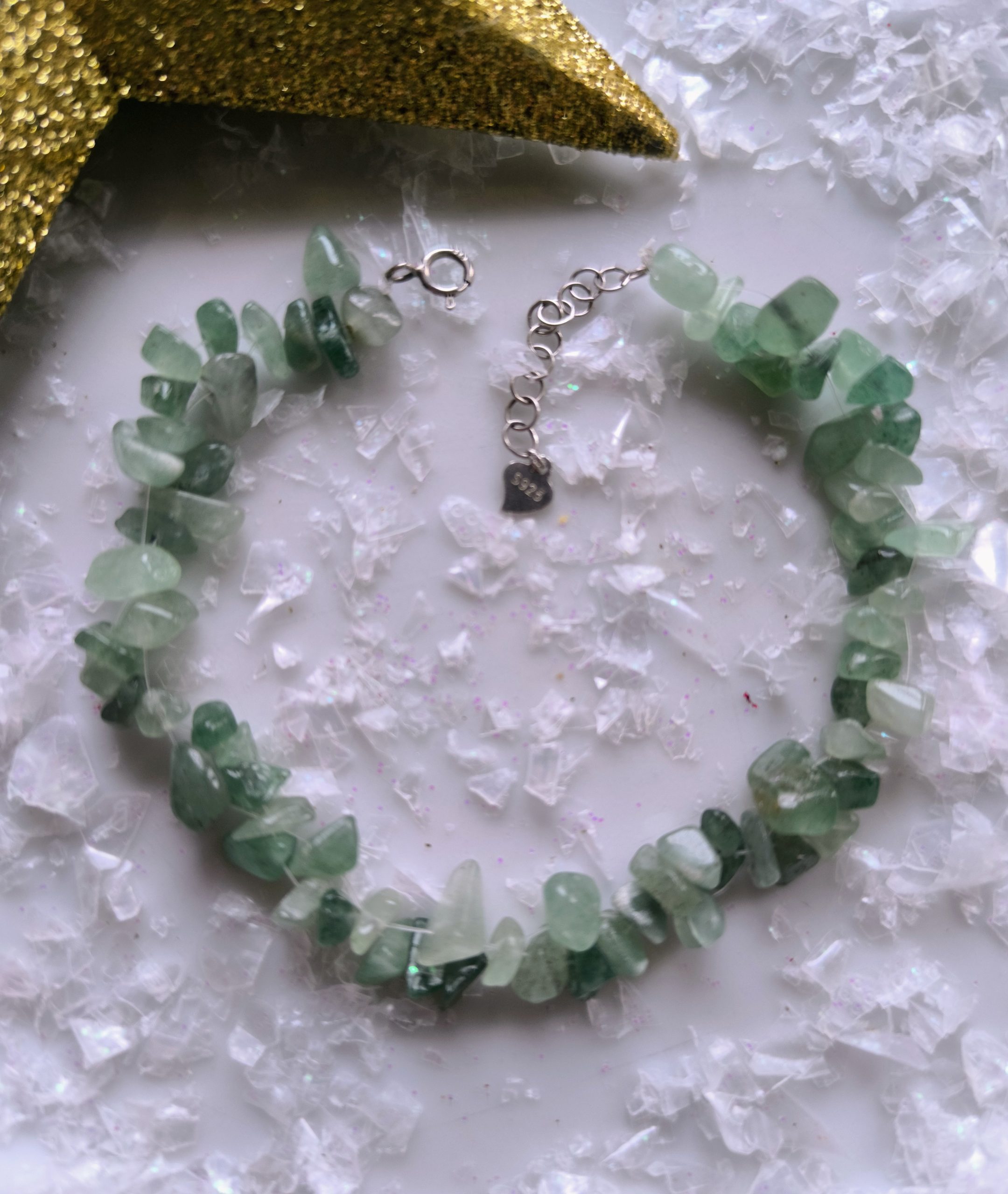 Esta pulsera está elaborada íntegramente a mano, utilizando más de 70 chispas de ágata natural color jade, cuidadosamente seleccionadas por su color, textura y armonía visual. Cada cuenta es diferente, lo que aporta riqueza, movimiento y un carácter orgánico único a la pieza.
