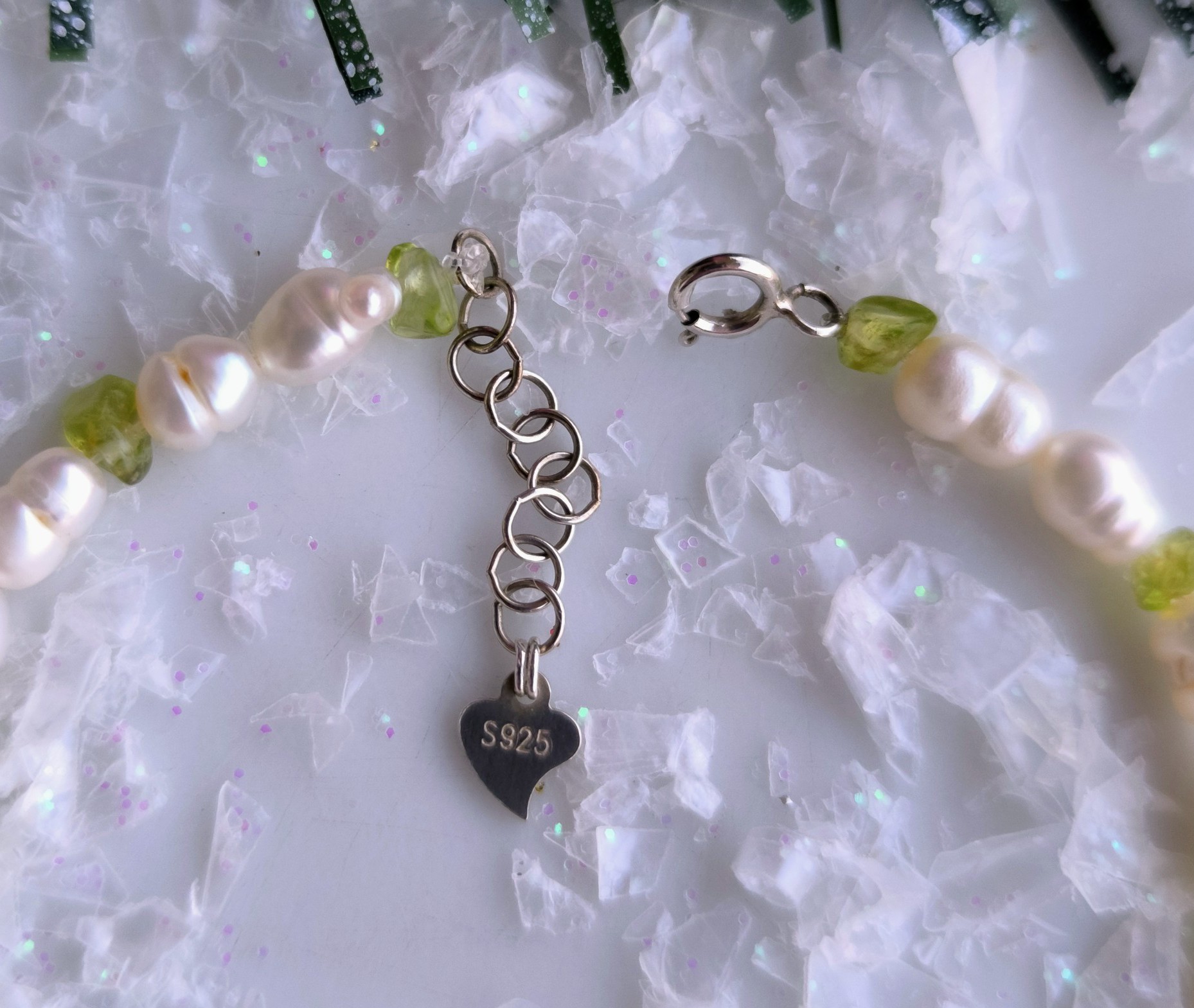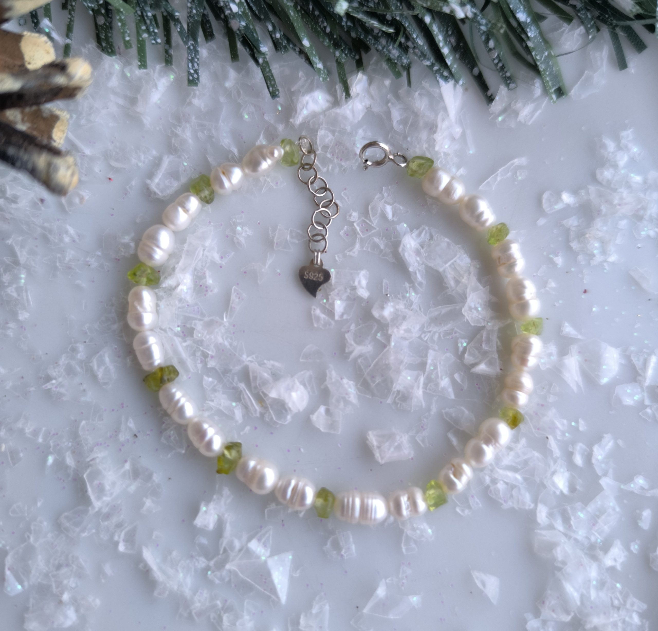 Esta pulsera está creada totalmente a mano, cuidando cada detalle, combinando la elegancia natural de las perlas de agua dulce en forma de grano de arroz con la frescura luminosa del peridoto natural.