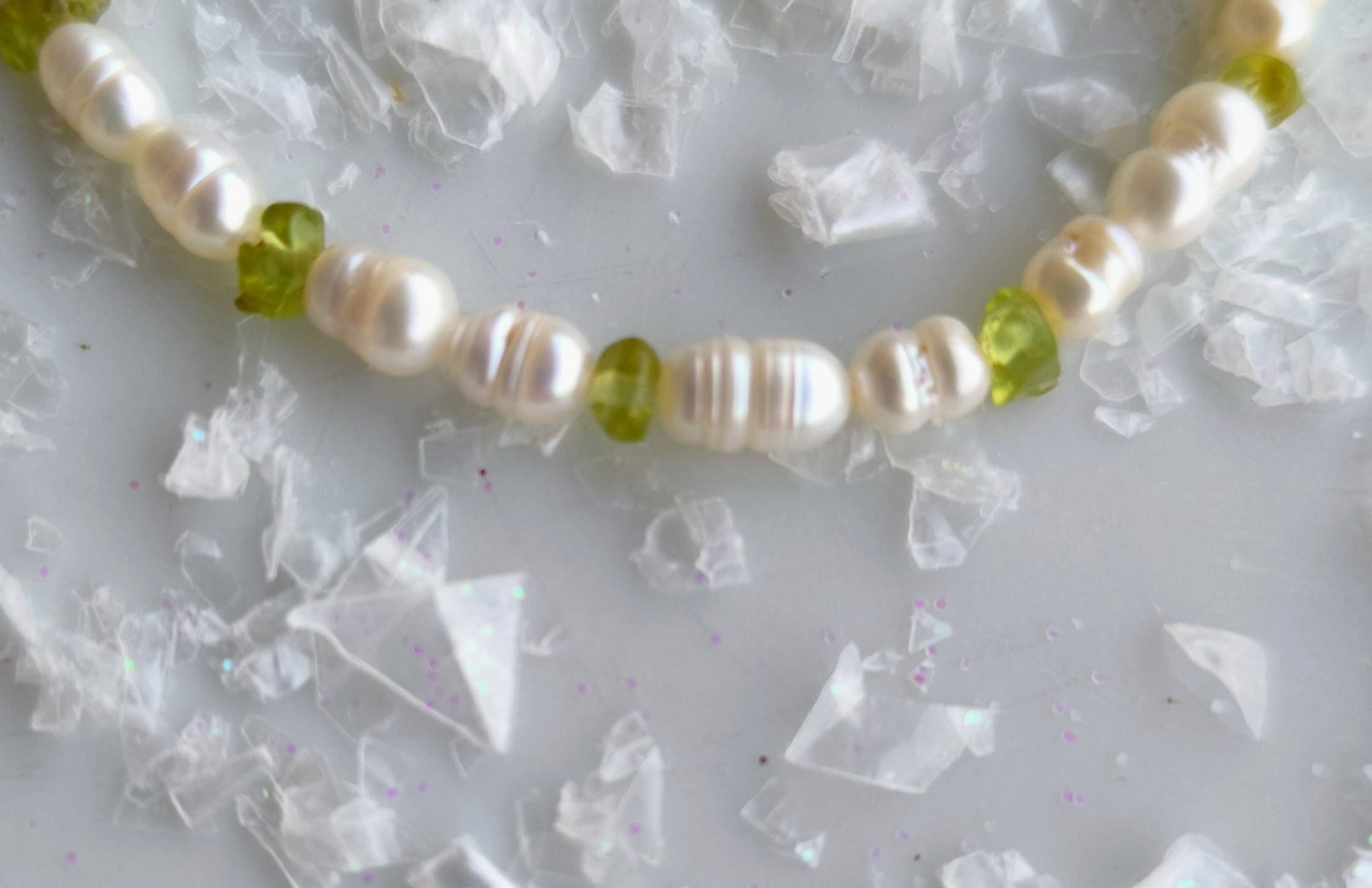 Las perlas aportan un brillo suave y atemporal, mientras que las cuentas de peridoto, con su tono verde transparente, añaden un toque de luz, equilibrio y sofisticación. Una pieza delicada, ligera y muy refinada, pensada para quienes valoran la belleza natural y el trabajo artesanal auténtico.